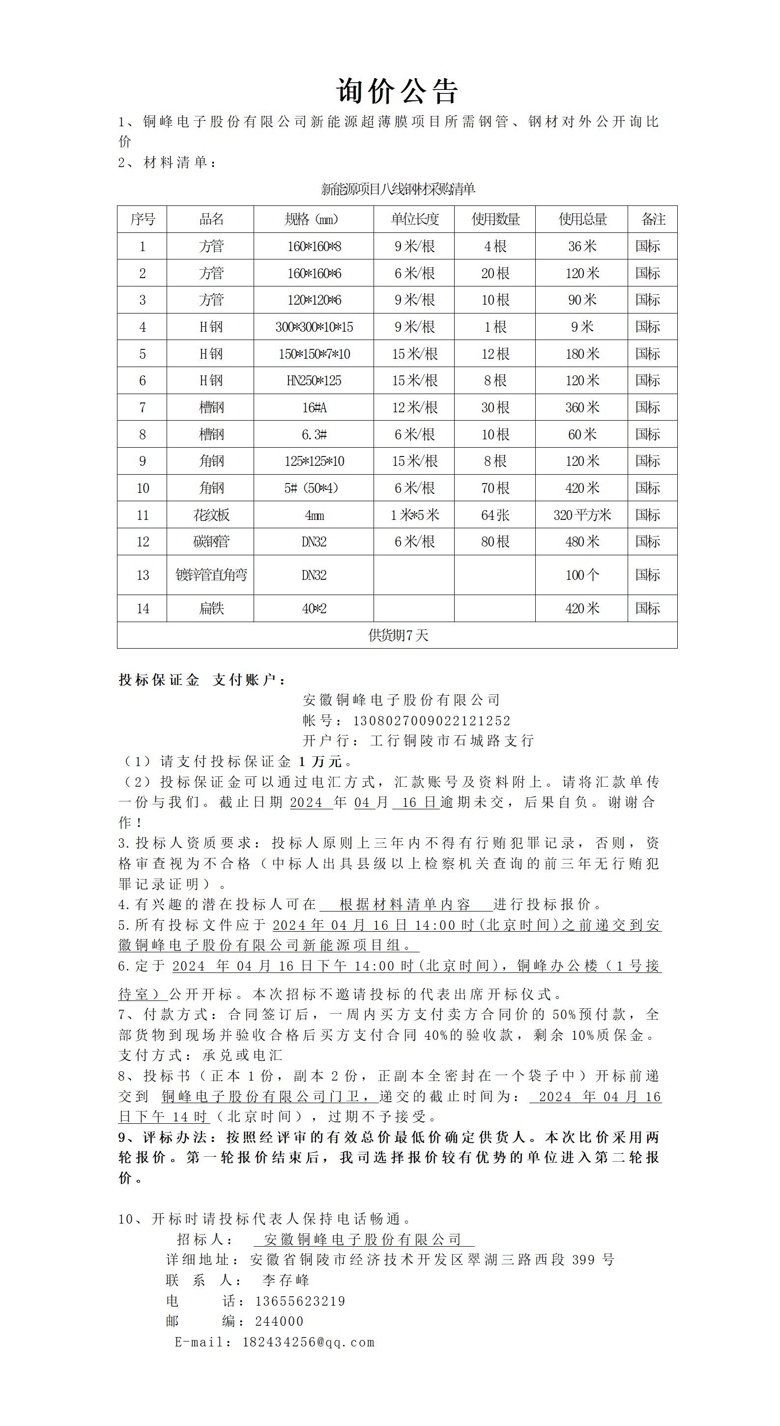 銅峰電子股份有限公司新項(xiàng)目八線鋼材詢價(jià)公告