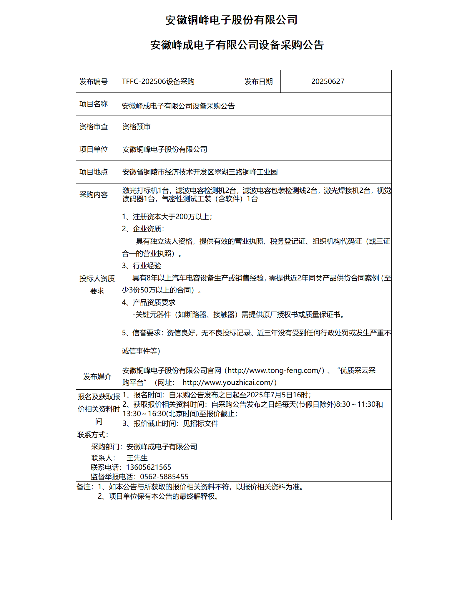 安徽峰成電子有限公司設(shè)備采購公告_01