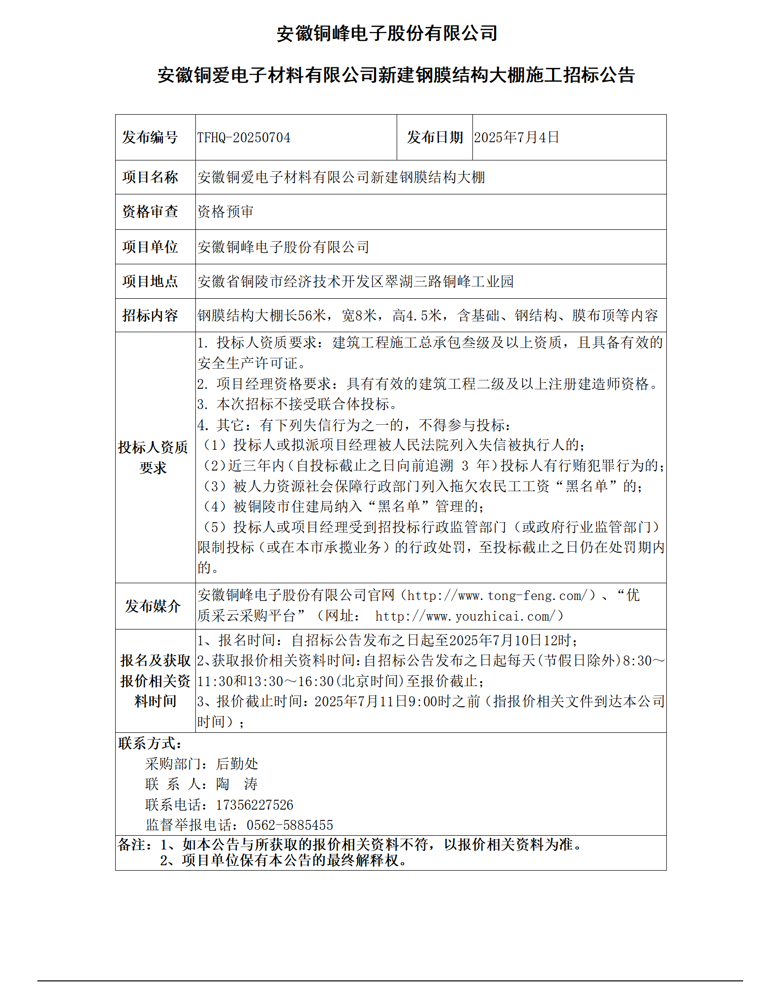 安徽銅峰電子股份有限公司 (安徽銅愛電子材料有限公司新建鋼膜結構大棚招標公告)_01
