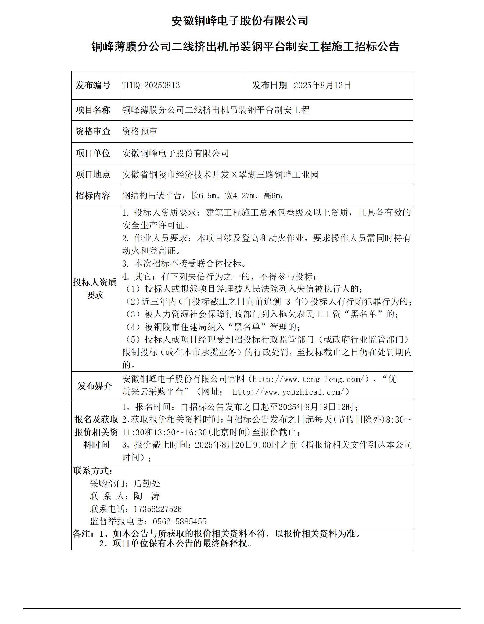 安徽銅峰電子股份有限公司 (銅峰薄膜分公司二線擠出機(jī)吊裝鋼平臺(tái)制安工程招標(biāo)公告)_01